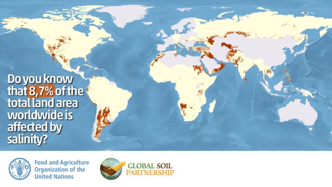 聯合國糧農組織舉行“世界土壤日”紀念活動。©糧農組織-農作方法不可持續,過度開發自然資源,人口不斷增長,這一切讓土壤承受的壓力越來越大,并造成土壤在全球范圍內以驚人的速度退化。-糧農組織10月發布的全球鹽堿土壤分布圖顯示,全球超過8.33億公頃的土壤已經受到鹽堿化的影響。 -根據測算,超過10%的農田出現鹽堿化,對全球糧食安全構成重大威脅。管理鹽堿化土壤需要綜合施策,采用可持續的土壤、灌溉和排水管理方式,選擇耐鹽作物和植物,包括能夠在鹽堿環境中良好生長的鹽生植物。